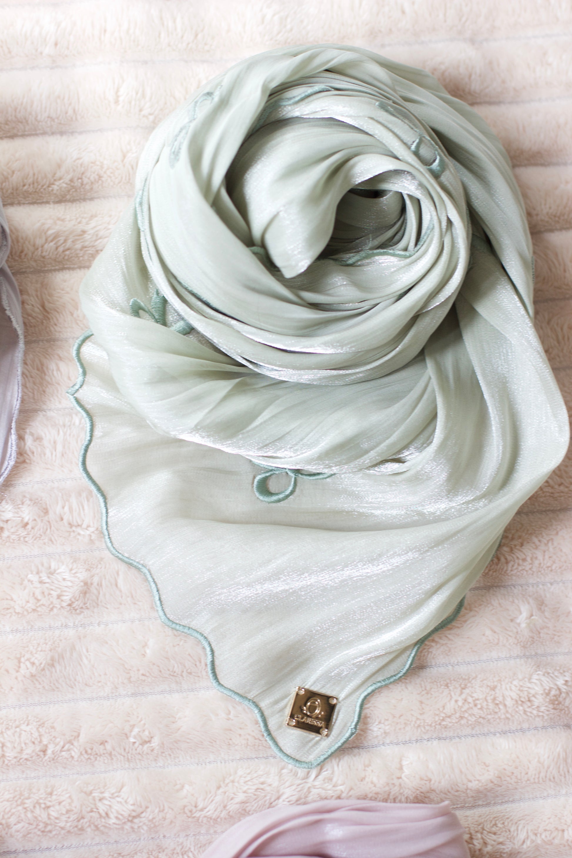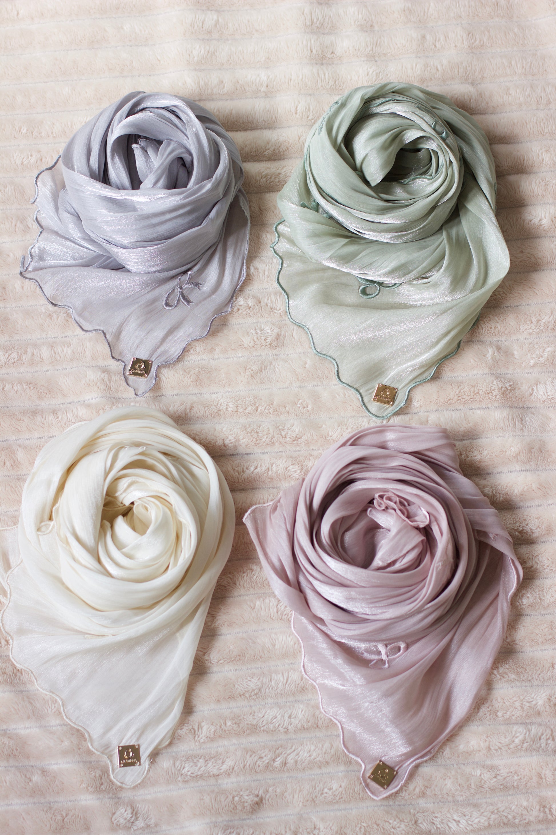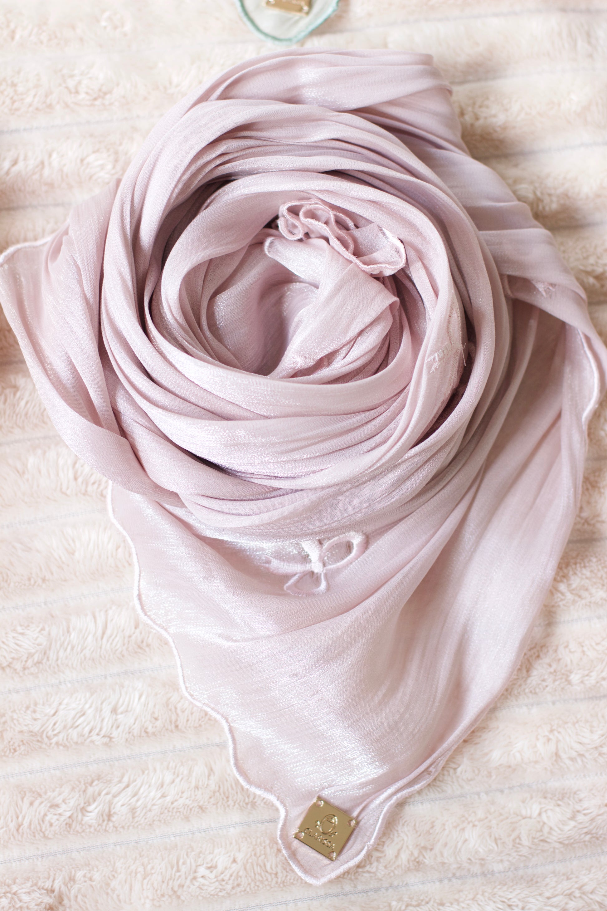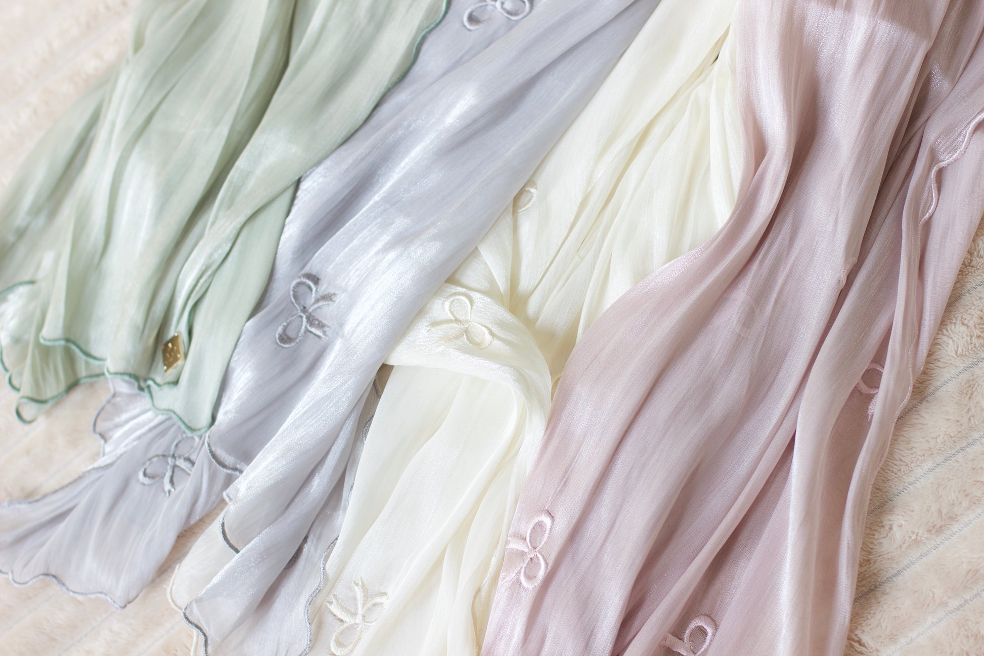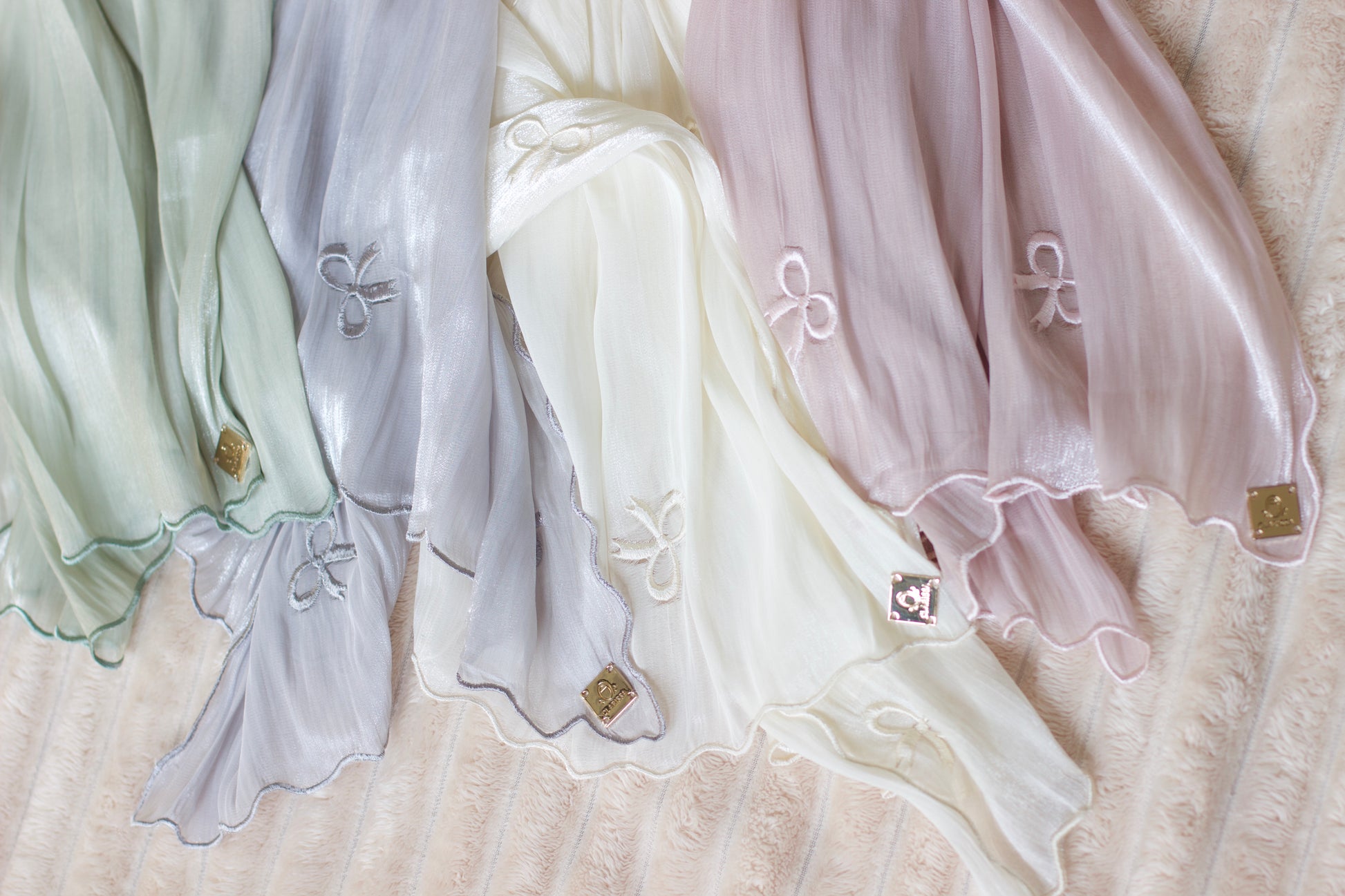 A soft shimmer fabric with an embroidered bow tie pattern and scalloped edges.